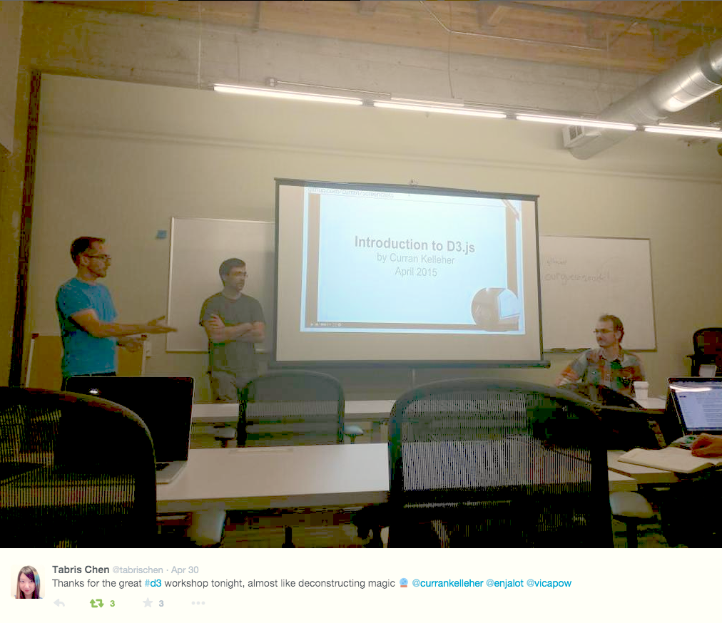 The video for this tutorial was recorded at a free event held in San Francisco on April 30, 2015. Many thanks to @enjalot and the Bay Area D3 Meetup Group for helping organize the event. Also big thanks to Galvanize for donating the great space for the evening.